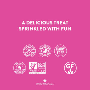 Brown rice, Tapioca syrup, Inulin, Rainbow sprinkles (sugar, potato flour, maltodextrin, coconut oil, spirulina extract, carnauba wax, beet red, anthocyanins, paprika, turmeric), Pea protein concentrate, Sunflower oil, Glycerin, Brown rice flour, Cane sugar, Natural flavour, Fruit and vegetable blend (apple extract, onion extract, broccoli, kale, cranberry, raspberry), Salt, Agar, Chickpea