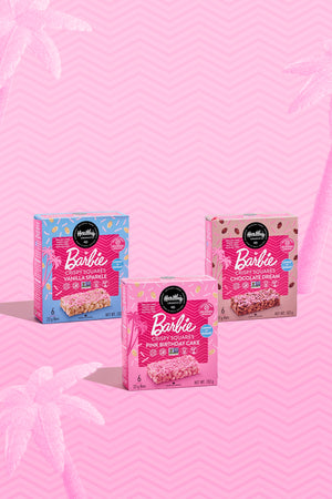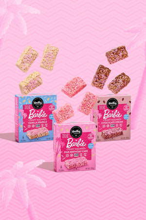 Enjoy all 3 Barbie Crispy Squares Dreams Collection together including Vanilla Sparkle, Pink Birthday Cake and Chocolate Dream. Made with brown rice and topped with pink sprinkles, our Barbie Crispy Squares is the perfect better-for-you treat that's lower in sugar and super delicious.