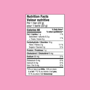 Brown rice, Tapioca fibre, Chicory root fiber, Unsweetened chocolate, Sunflower oil, Pink sprinkles (sugar, potato starch, maltodextrin, rice bran oil, lemon juice, beet red, carnauba wax), Vegetable Glycerin, Cocoa powder, Rice syrup, Salt, Natural flavour, Agar, Chickpea.